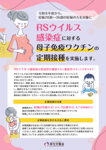 RSウイルス母子免疫ワクチンの定期接種を開始する予定です。 |